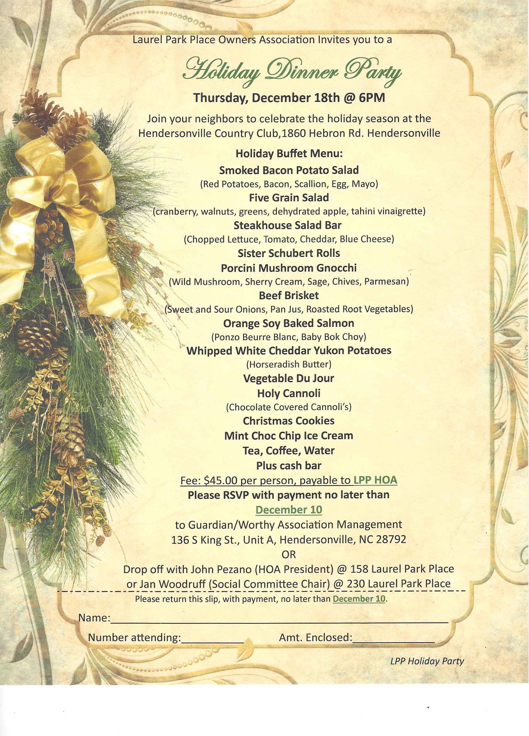 Our annual Holiday Party will be held at the Hendersonville Country Club on Thursday, December 18 at 6pm.